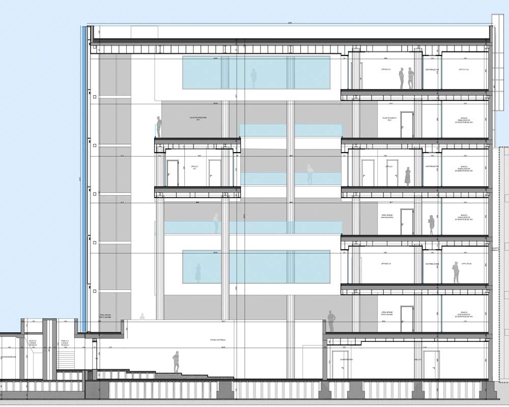 L’edificio, progettato come sede di rappresentanza istituzionale e cuore direzionale dell’università, si distingue per la qualità architettonica e per la capacità di coniugare immagine, funzionalità e comfort. Le ampie superfici vetrate, i volumi sospesi e l’organizzazione degli spazi interni riflettono un approccio contemporaneo e dinamico, coerente con la missione di un ateneo orientato all’innovazione e alla ricerca.